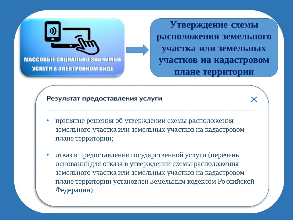 2) или отказ в предоставлении государственной услуги (исчерпывающий перечень оснований для отказа в утверждении схемы расположения земельного участка или земельных участков на кадастровом плане территории установлен пунктом 16 статьи 11.10 Земельного кодекса Российской Федерации).