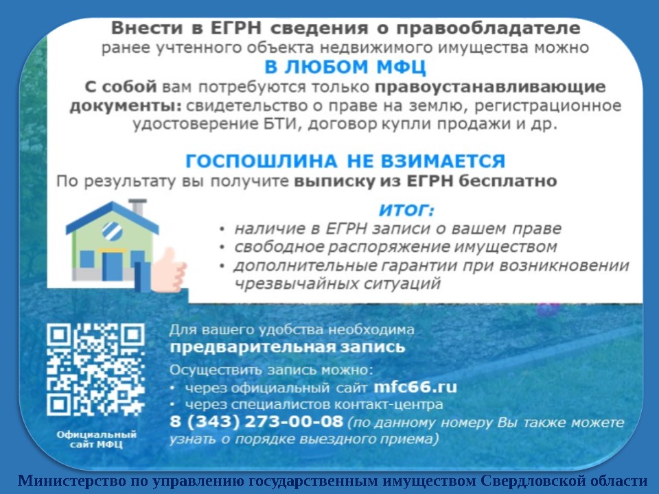 Мингосимущество информирует о проведении на территории Свердловской области масштабной работы, направленной на оформление в надлежащем порядке прав граждан, возникших в отношении объектов недвижимости до 31 января 1998 года, то есть до даты вступления в силу Федерального закона от 21 июля 1997 года № 122-ФЗ «О государственной регистрации прав на недвижимое имущество и сделок с ним».