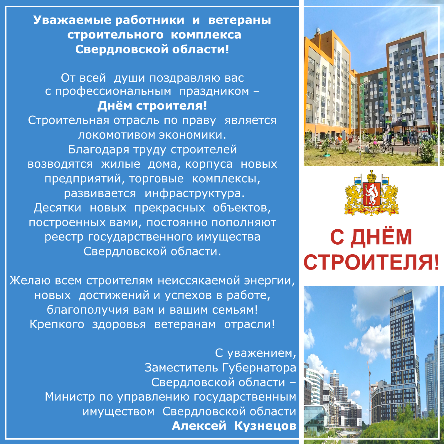 Поздравление Заместителя Губернатора Свердловской области – Министра по управлению государственным имуществом Свердловской области Алексея Кузнецова с Днём строителя!