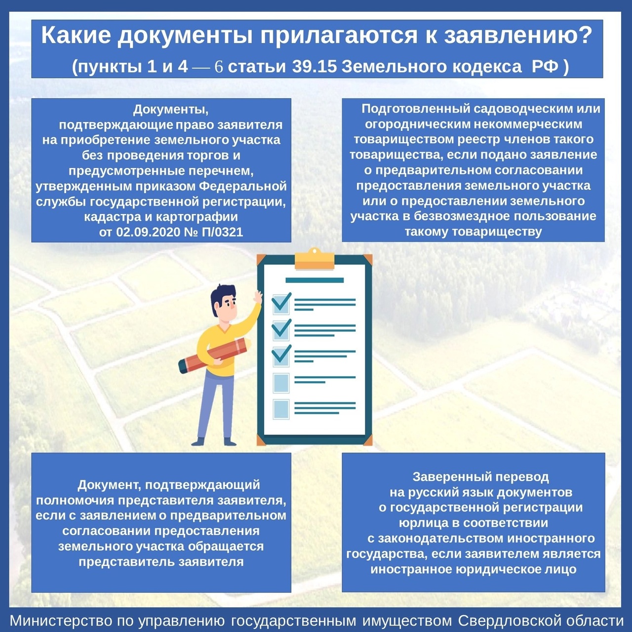 Мингосимущество Свердловской области предоставляет 12 массовых социально значимых услуг в электронном виде.В перечень таких услуг включена государственная услуга по предоставлению в собственность, аренду, постоянное (бессрочное) пользование, безвозмездное пользование земельного участка, находящегося в государственной или муниципальной собственности, без проведения торгов.Испрашиваемый земельный участок должен быть сформирован и поставлен на кадастровый учет.Срок оказания услуги 14 календарных дней.Результатом услуги является договор аренды, договор купли-продажи, договор безвозмездного пользования, решение о предоставлении участка в постоянное (бессрочное) пользование.Перечень документов, необходимых для предоставления услуги, в зависимости от категории заявителя и основания для обращения установлен приказом Росреестра от 02.09.2020 № П/0321.Случаи предоставления участков в аренду установлены Земельным кодексом Российской Федерации.При подборе земельного участка можно руководствоваться публичной кадастровой картой на сайте https://pkk5.rosreestr.ru.Основания для отказа в предоставлении земельного участка, находящегося в государственной или муниципальной собственности, без проведения торгов установлены статьей 39.16 Земельного кодекса Российской Федерации.Получить консультацию по данной услуге можно по телефонам: 8(343) 312-09-40 (добавочные: 483,435,547,455,534,402) или направив обращение на электронною почту: mugiso@egov66.ru.