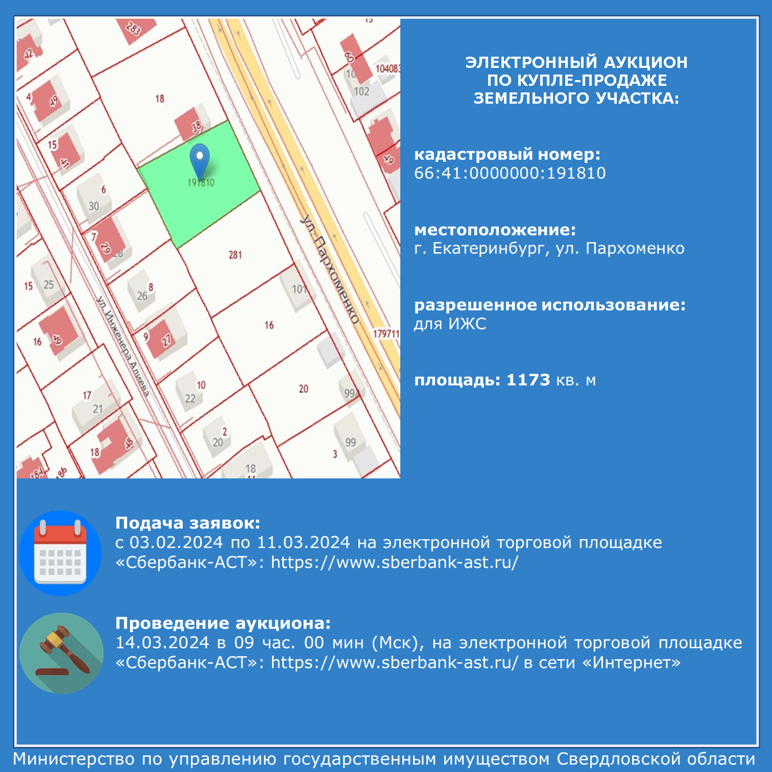 1) Предмет аукциона: продажа земельного участка из земель населенных пунктов, с кадастровым номером 66:41:0000000:191810, местоположение: Свердловская область, г. Екатеринбург, ул. Пархоменко, разрешенное использование - для индивидуального жилищного строительства, общей площадью 1 173 кв. метра.