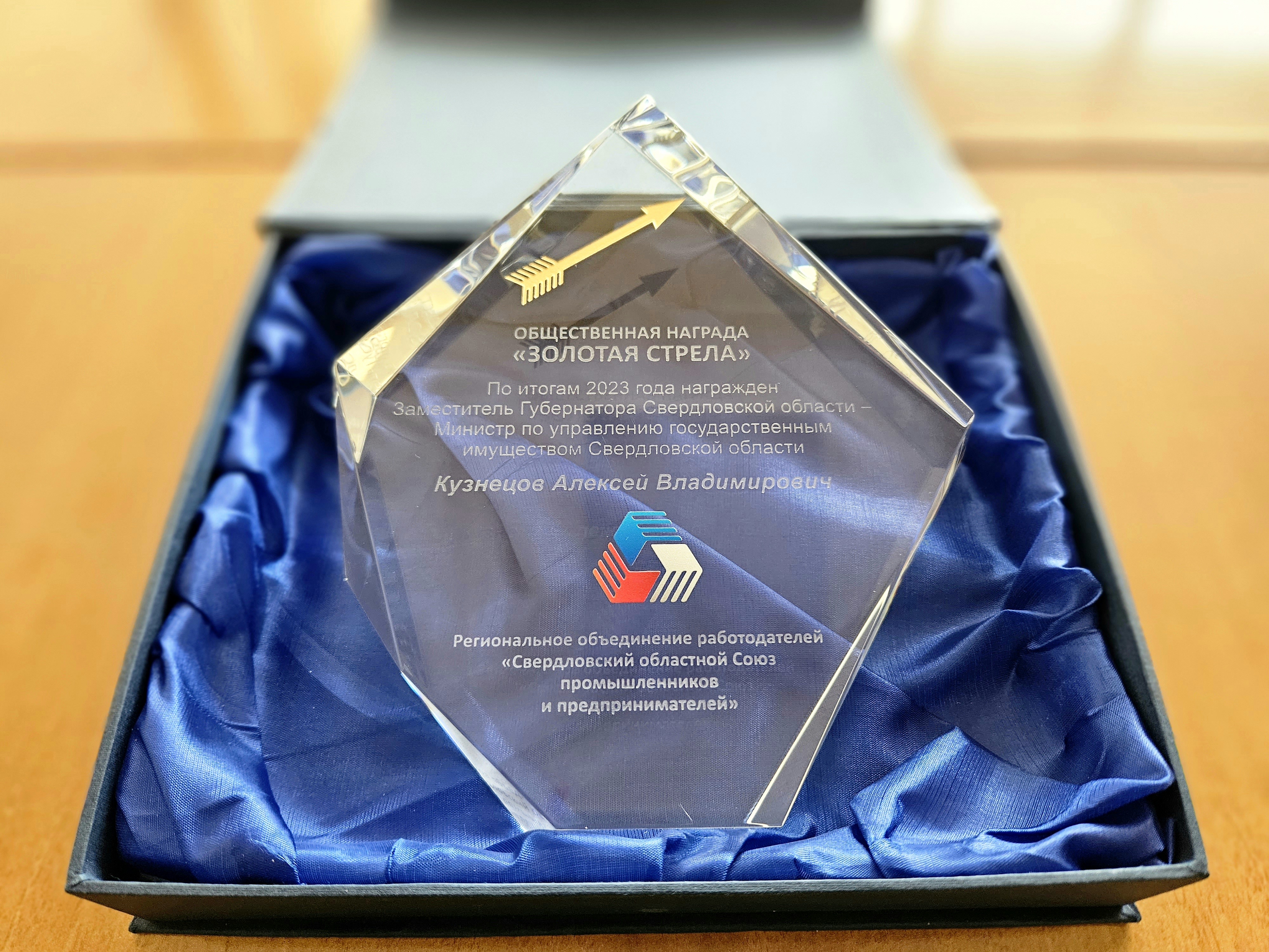 Заместитель Губернатора Свердловской области - Министр по управлению государственным имуществом Алексей Кузнецов удостоен общественной награды «Золотая стрела»! Поздравляем Алексея Владимировича! Ежегодно Свердловский областной союз промышленников и предпринимателей проводит свои мероприятия по выбору лучших представителей органов государственной власти, которые по мнению бизнеса, внесли наибольший вклад в развитие промышленности и предпринимательства на территории Свердловской области