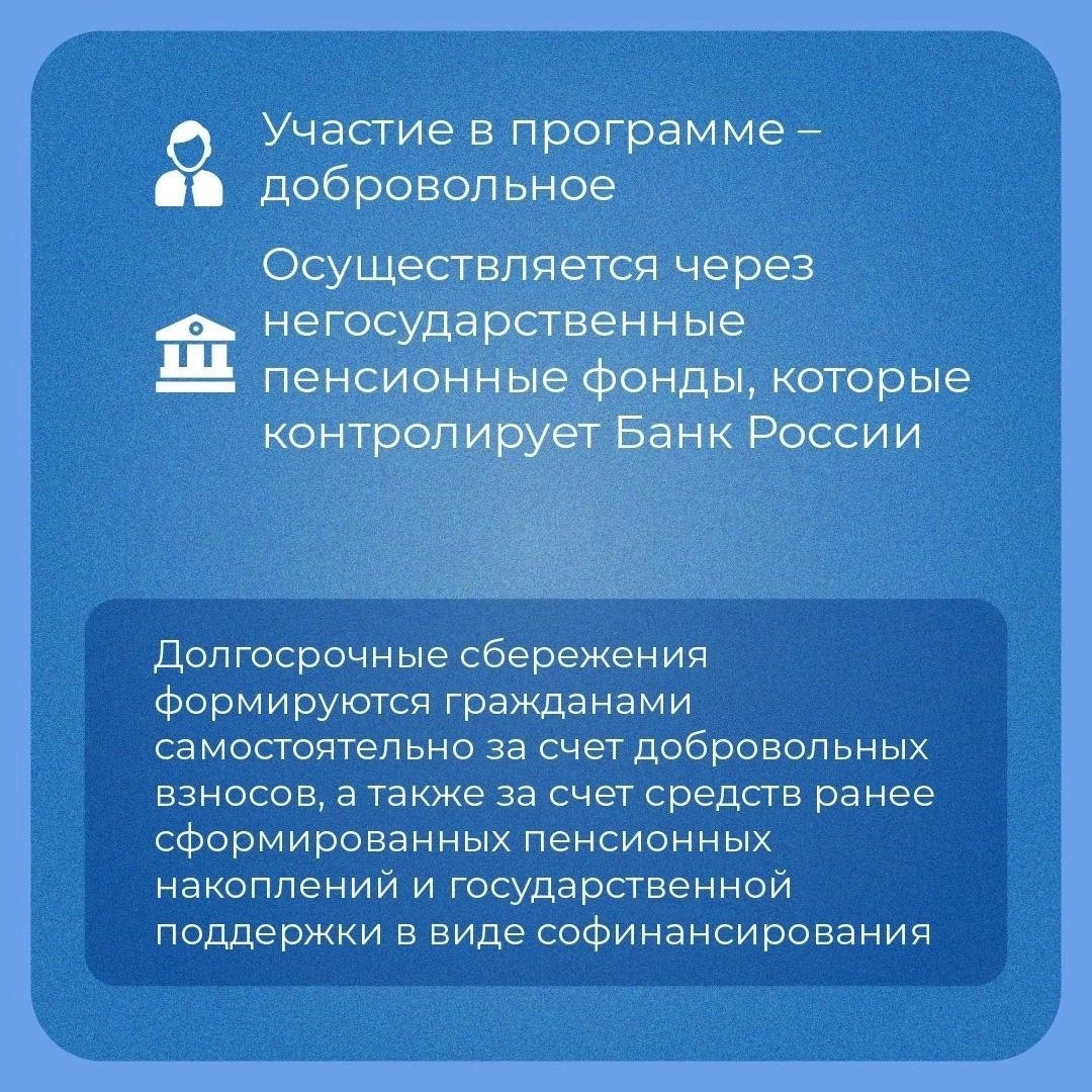 Программа долгосрочных сбережений начала свою работу с января 2024. Это сберегательный продукт, который поможет получать гражданам дополнительный доход в будущем или создать "подушку безопасности" на любые цели.