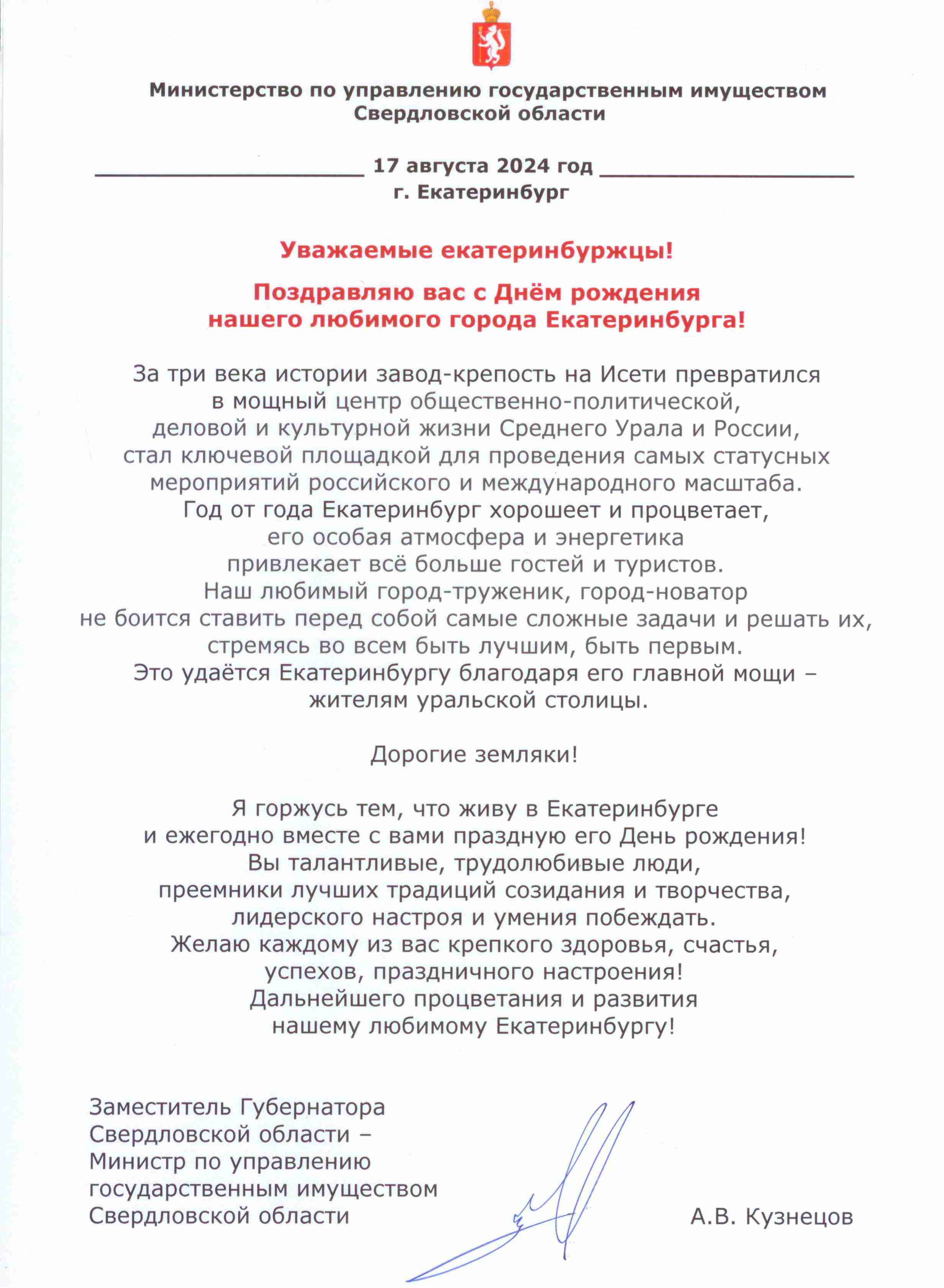 Поздравление Алексея Кузнецова с Днём города Екатеринбурга